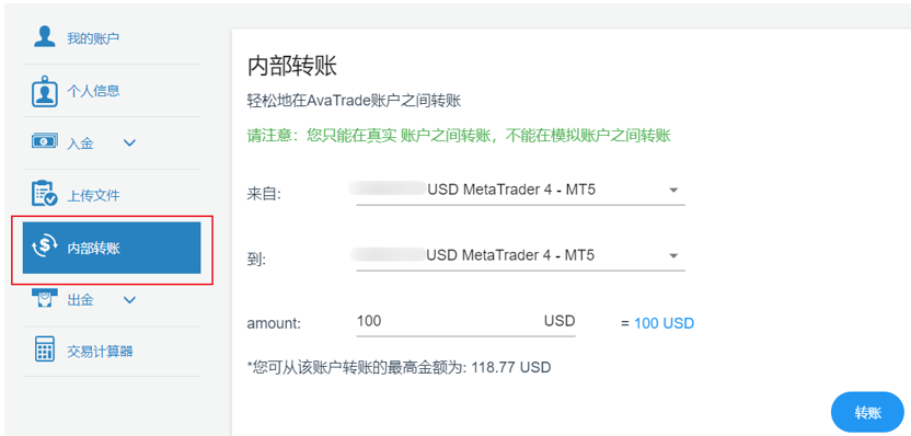 如果两个交易账户(真实)都在同一个用户名下,您可以在 “我的账户” 中选择 “内部转账” 选项: