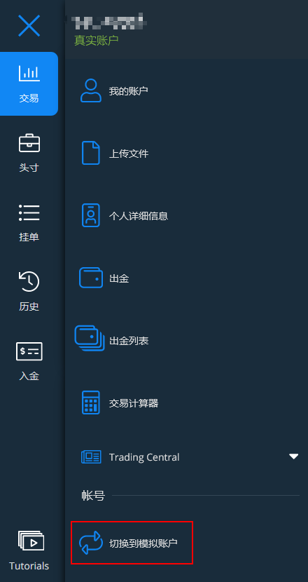 如需添加模拟账户,请单击菜单并选择“切换到模拟账户”。